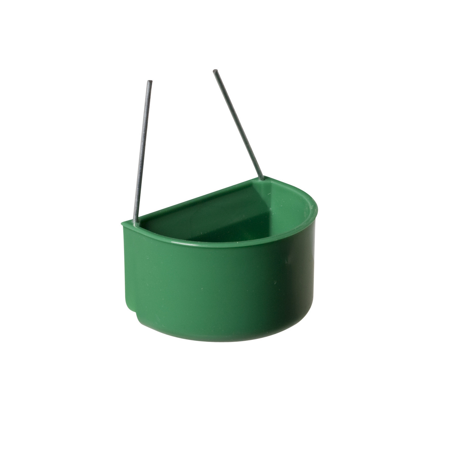 Halbrunde Futterwanne mit biegbaren Metallhaken. Halbrunde Futterwanne mit biegbarem Metallbefestigung, so dass sie in jedem Käfig aufgehängt werden können.