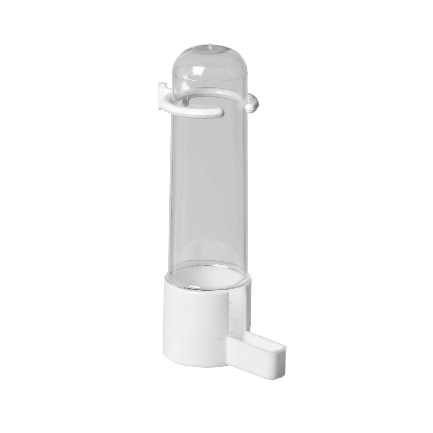 Trinkbrunnen für Käfigvögel. Die Stabtränke wird zwischen den vertikalen Stäben außen am Käfig eingeklemmt, so dass das Wasser leicht ausgetauscht werden kann. Da Vögel das Trinkwasser schwer verschmutzen können, haben sie immer sauberes Wasser.